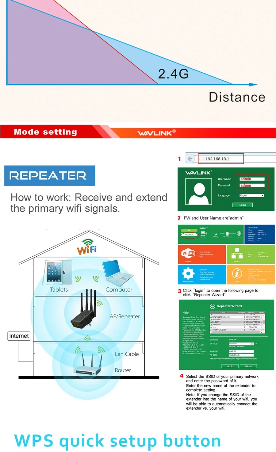 1, The wifi extender mode of this device can be set up by wireless device such as smart phone or laptop.